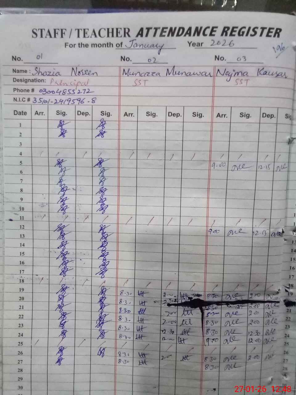 | Remarks (Use Separate Page if Required): 1 Fakhara khanum on earned leave as per attendance register but the leave still not approved so as per SOP marked her absent. 2 No administration visit in previous month | |||||