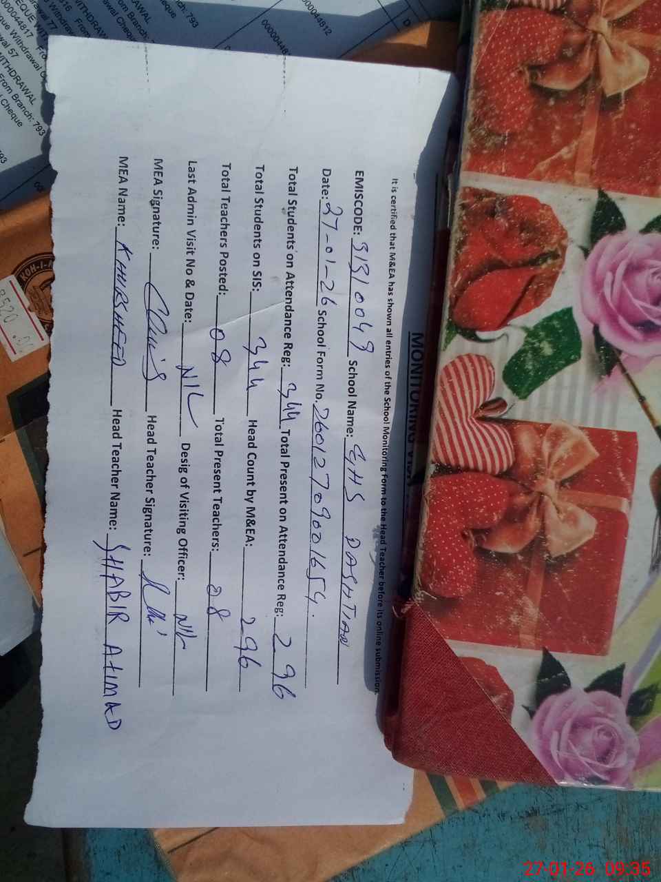 | Attendance Register | Head Teacher | MEA with School | Visit Proof |