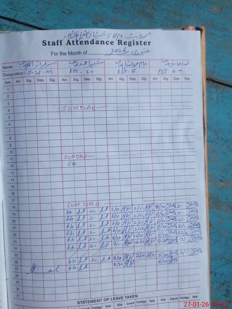 | CNIC | Full Name | Designation | R/C | Absence During Last Calender Month |