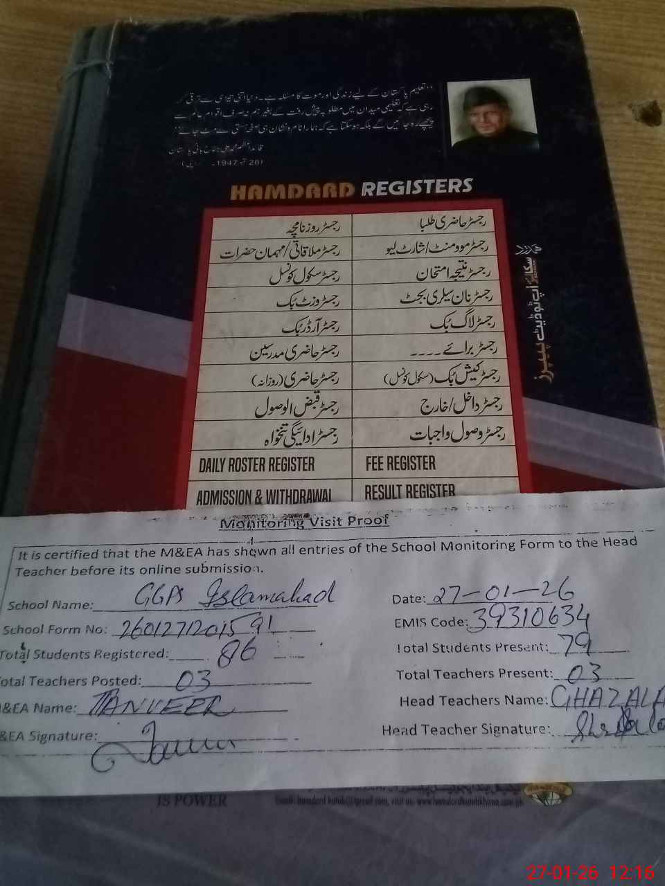 | Attendance Register | Head Teacher | MEA with School | Visit Proof |