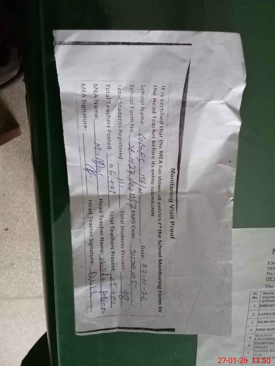 | Attendance Register | Head Teacher | MEA with School | Visit Proof |