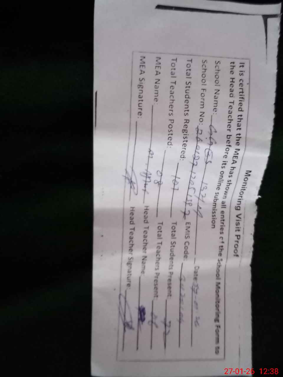 | Attendance Register | Head Teacher | MEA with School | Visit Proof |