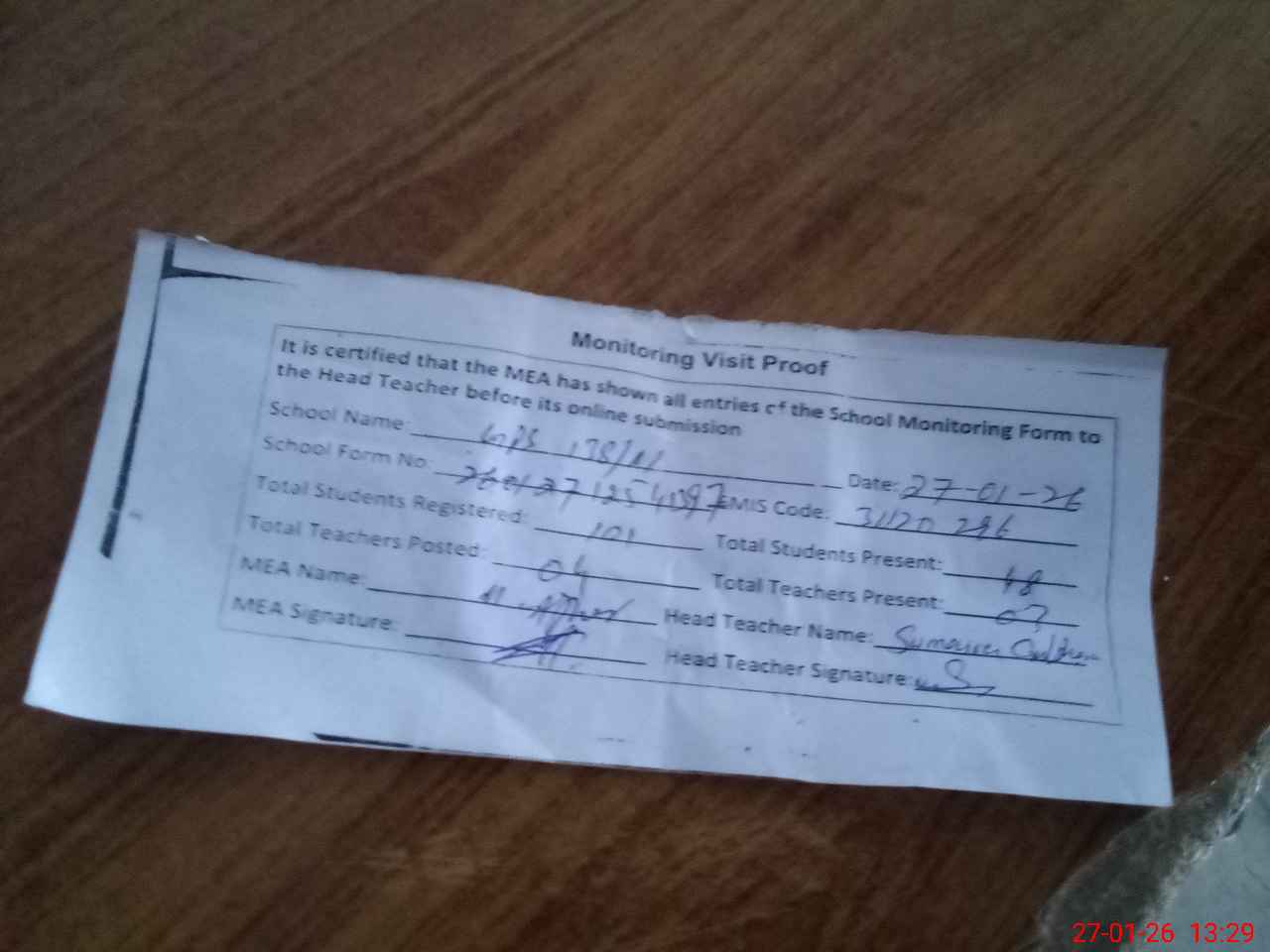 | Attendance Register | Head Teacher | MEA with School | Visit Proof |