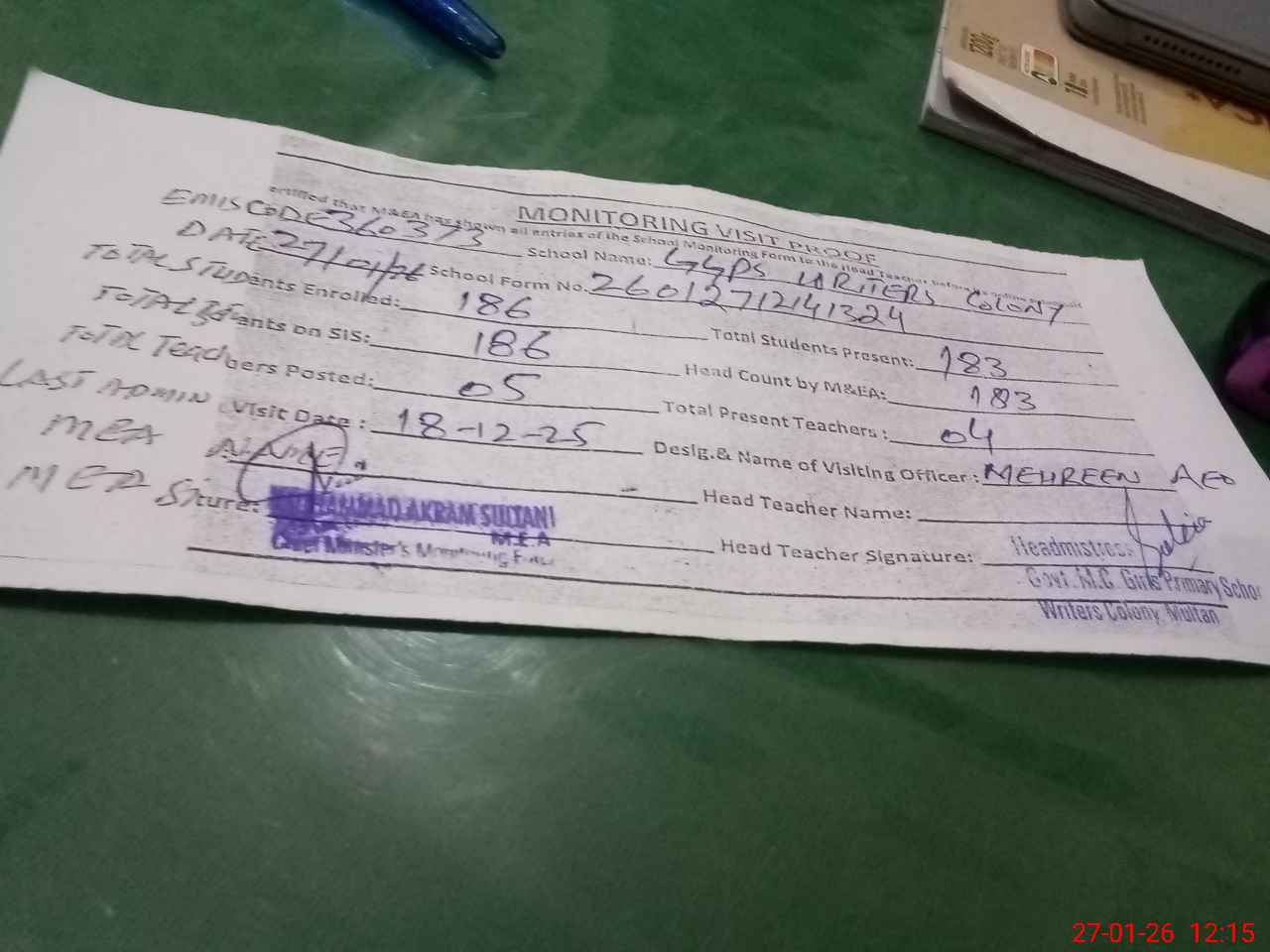 | Attendance Register | Head Teacher | MEA with School | Visit Proof |