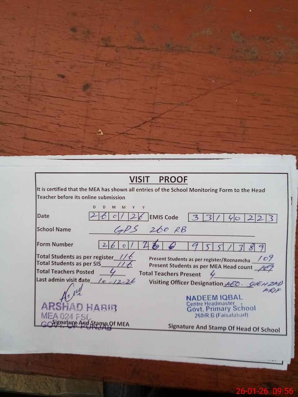 | Attendance Register | Head Teacher | MEA with School | Visit Proof |