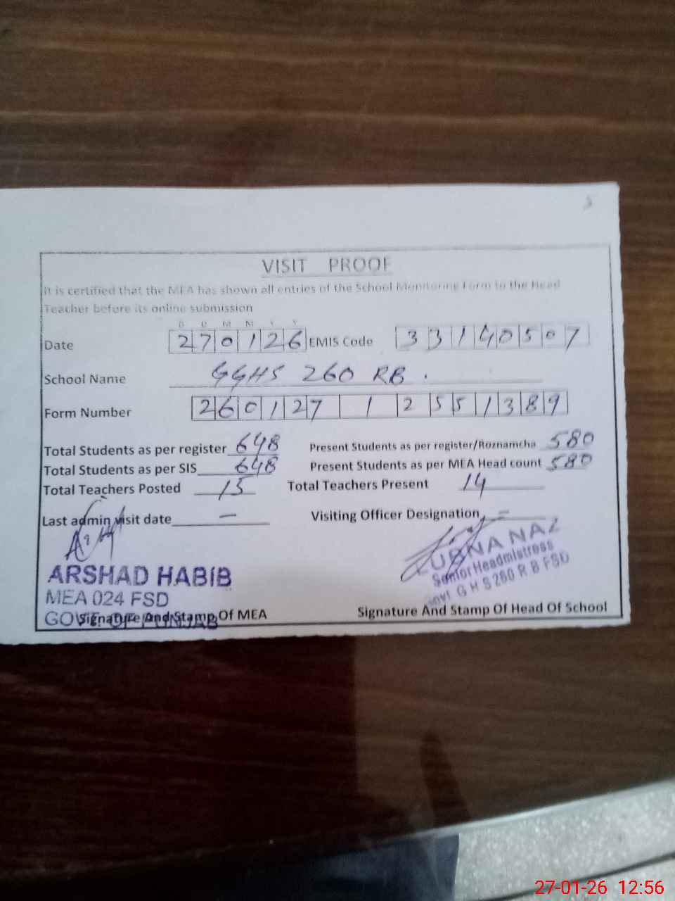 | Attendance Register | Head Teacher | MEA with School | Visit Proof |