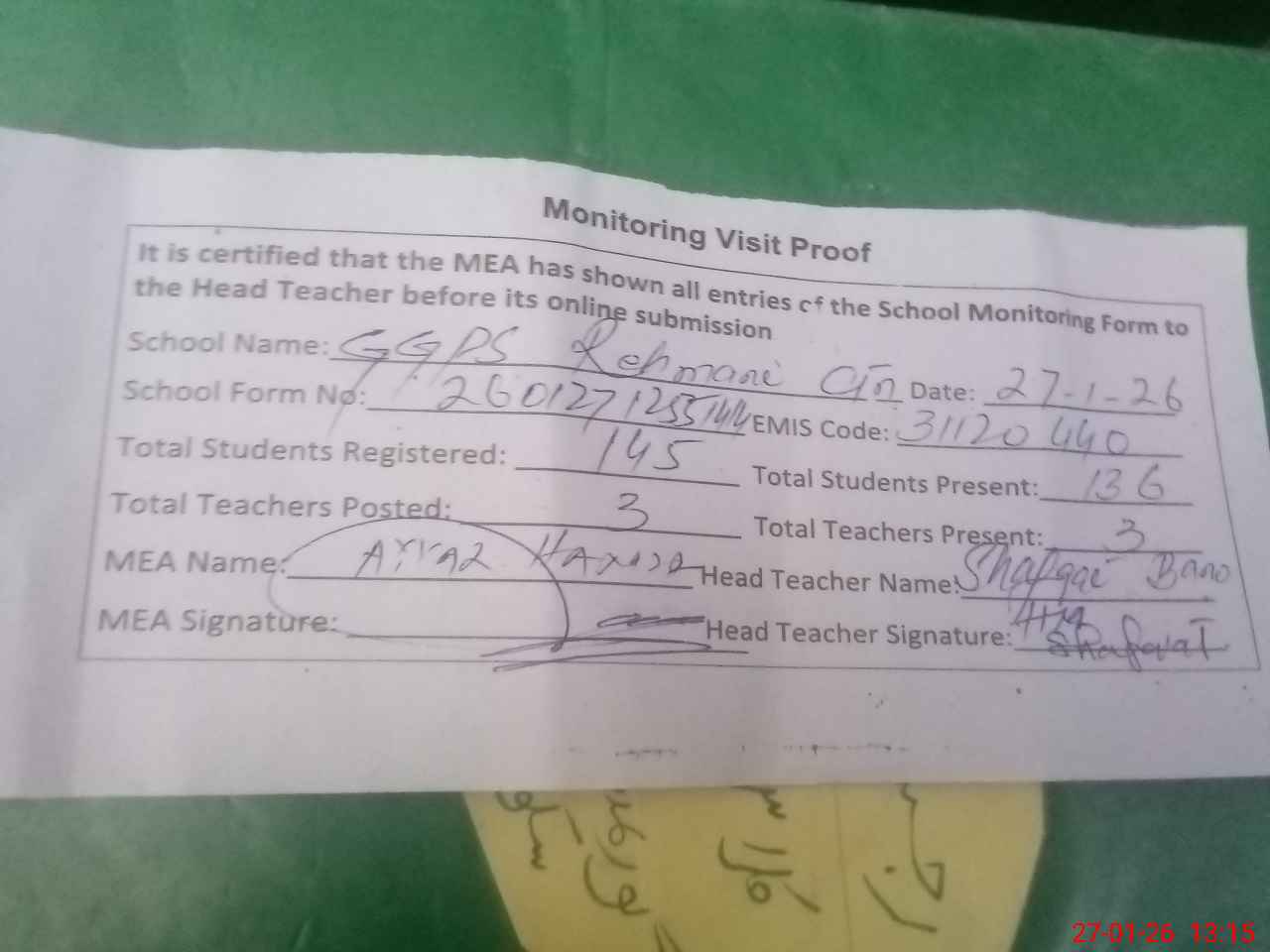 | Attendance Register | Head Teacher | MEA with School | Visit Proof |