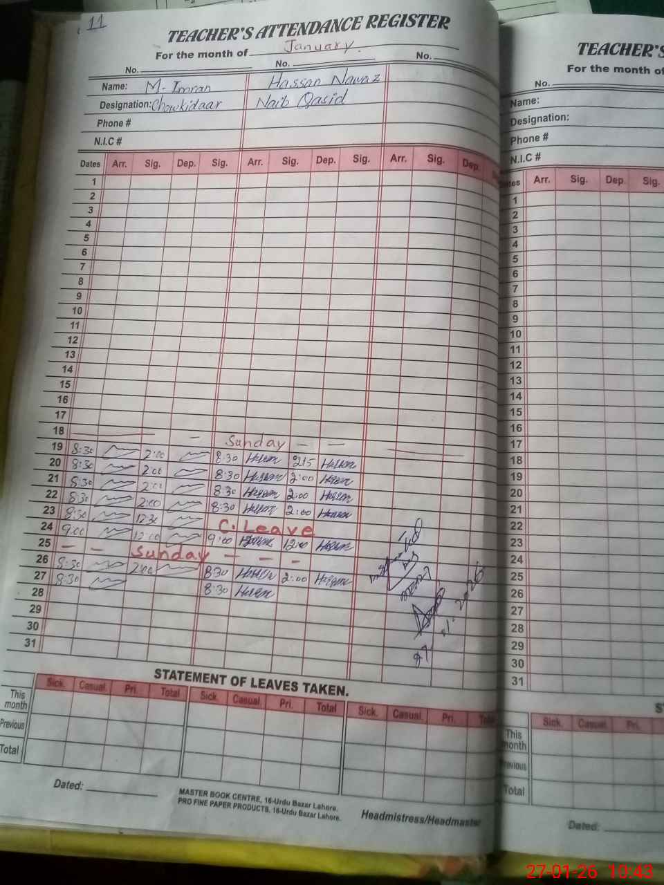 | CNIC | Full Name | Designation | R/C | Absence During Last Calender Month |
