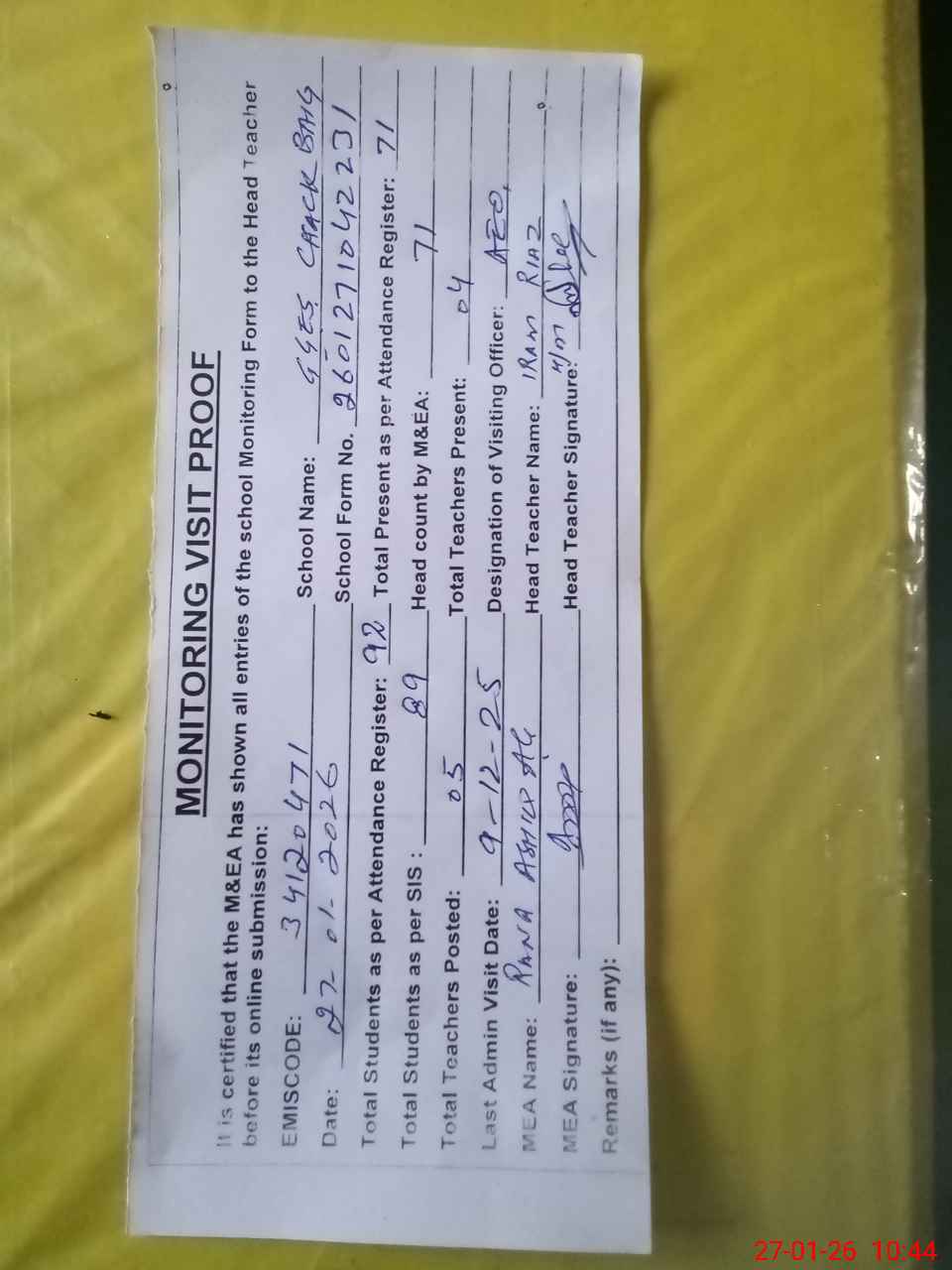 | Attendance Register | Head Teacher | MEA with School | Visit Proof |