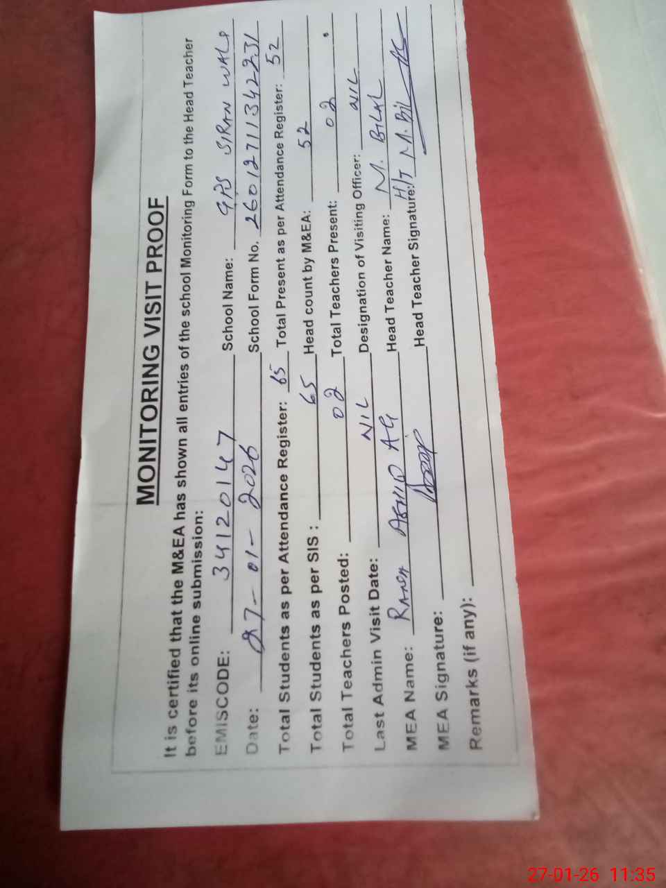 | Attendance Register | Head Teacher | MEA with School | Visit Proof |