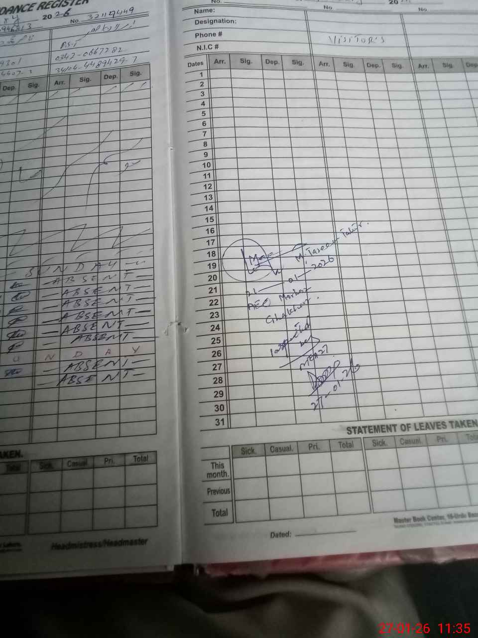 | CNIC | Full Name | Designation | R/C | Absence During Last Calender Month |