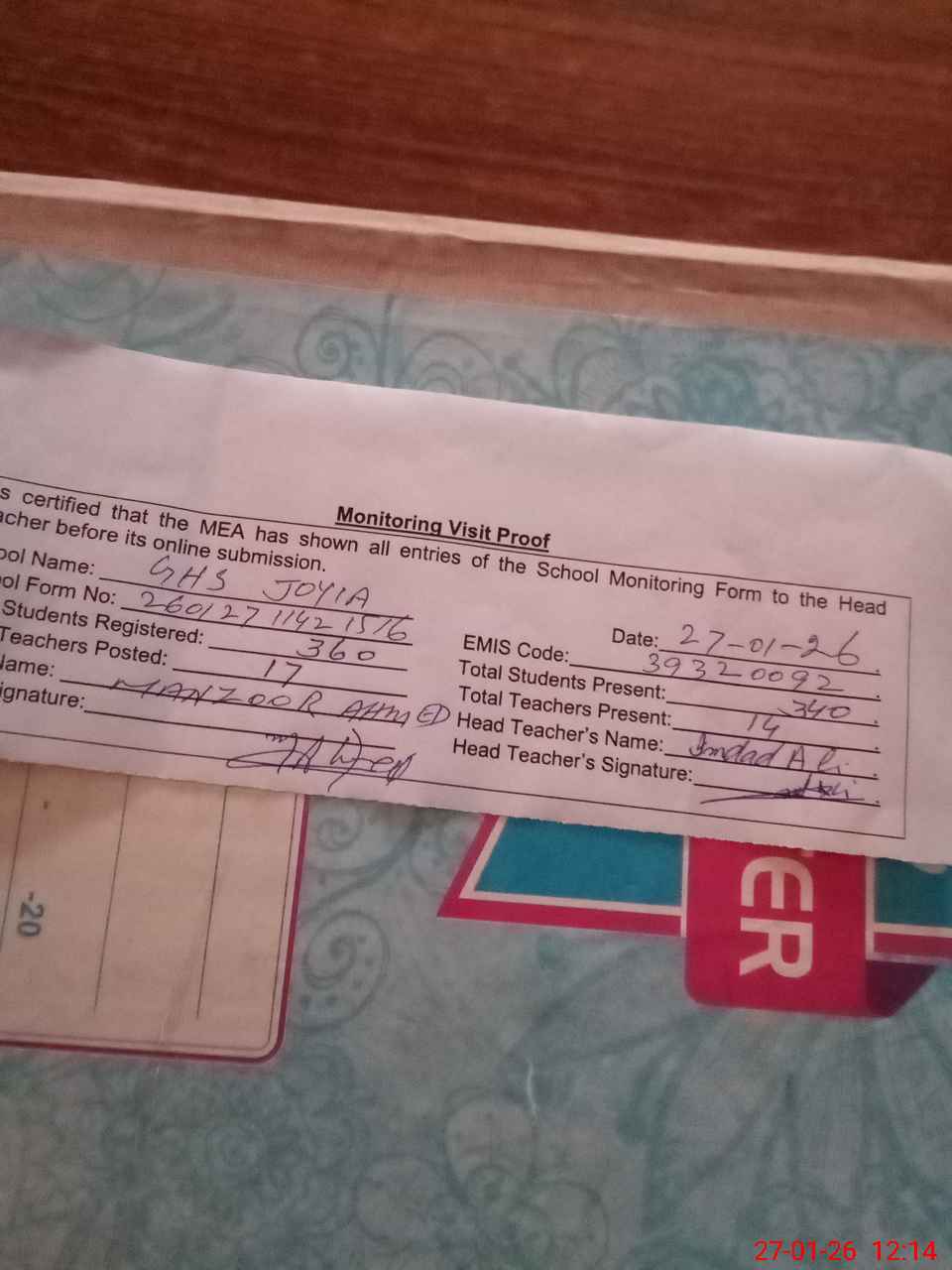| Attendance Register | Head Teacher | MEA with School | Visit Proof |