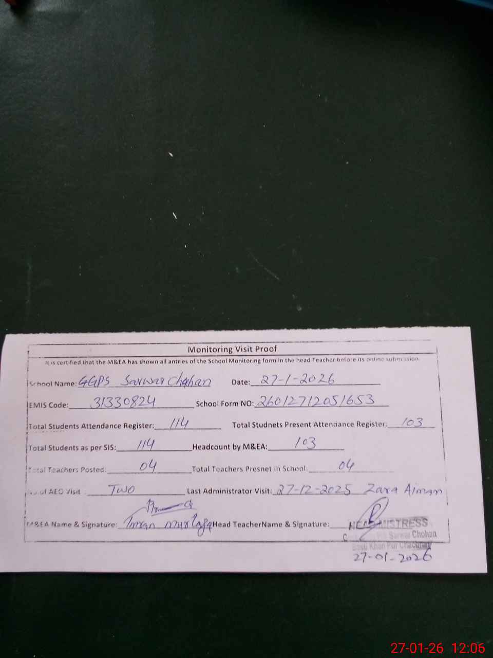 | Attendance Register | Head Teacher | MEA with School | Visit Proof |