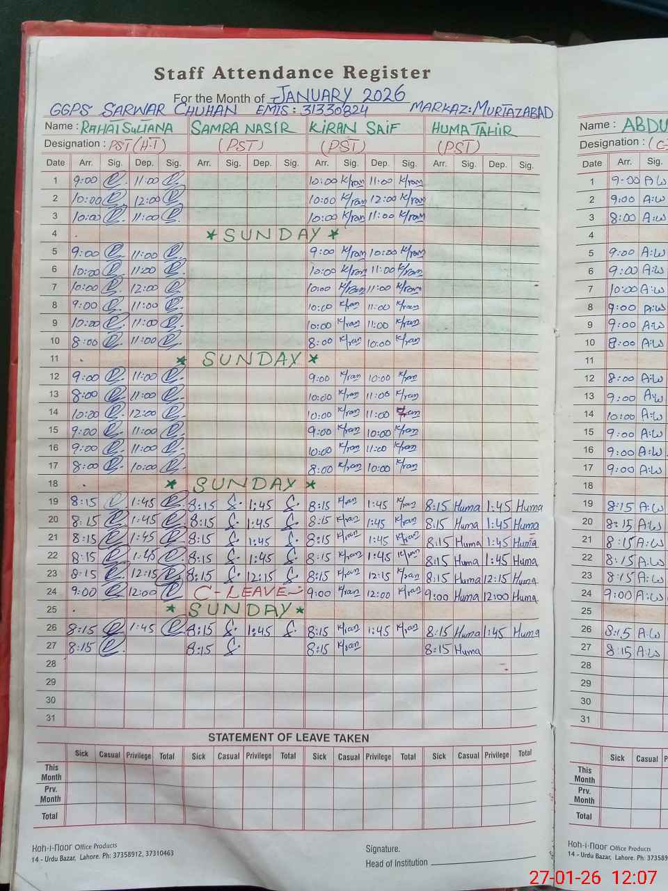 | Leave | Duty | Absent | Maternity | Medical | Ex- Pak |