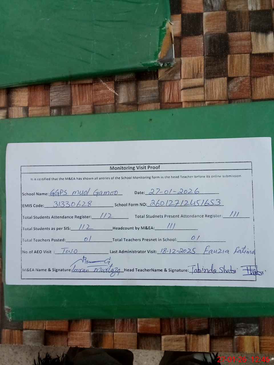 | Attendance Register | Head Teacher | MEA with School | Visit Proof |