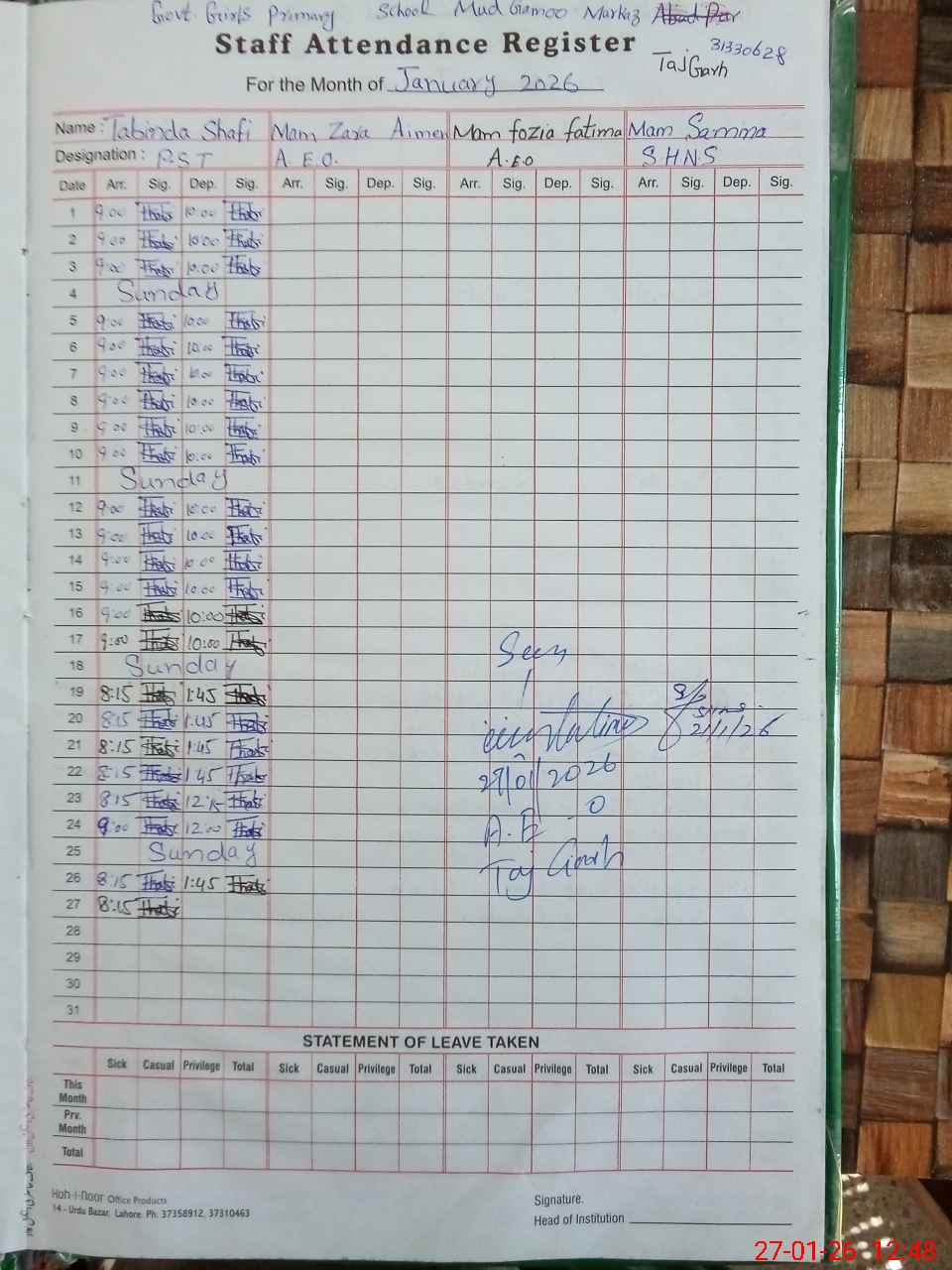 | Name: Ta**** Sh**** Designation: (School Headmaster's/Headmistress's) PST/PTC/JV Phone/Cell Number: 03**** |