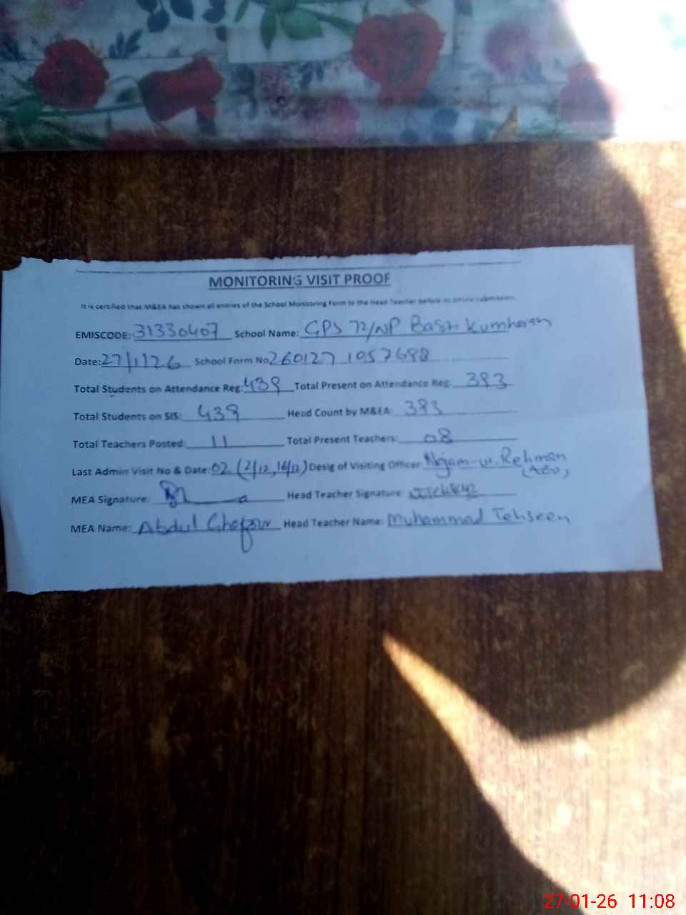 | Attendance Register | Head Teacher | MEA with School | Visit Proof |