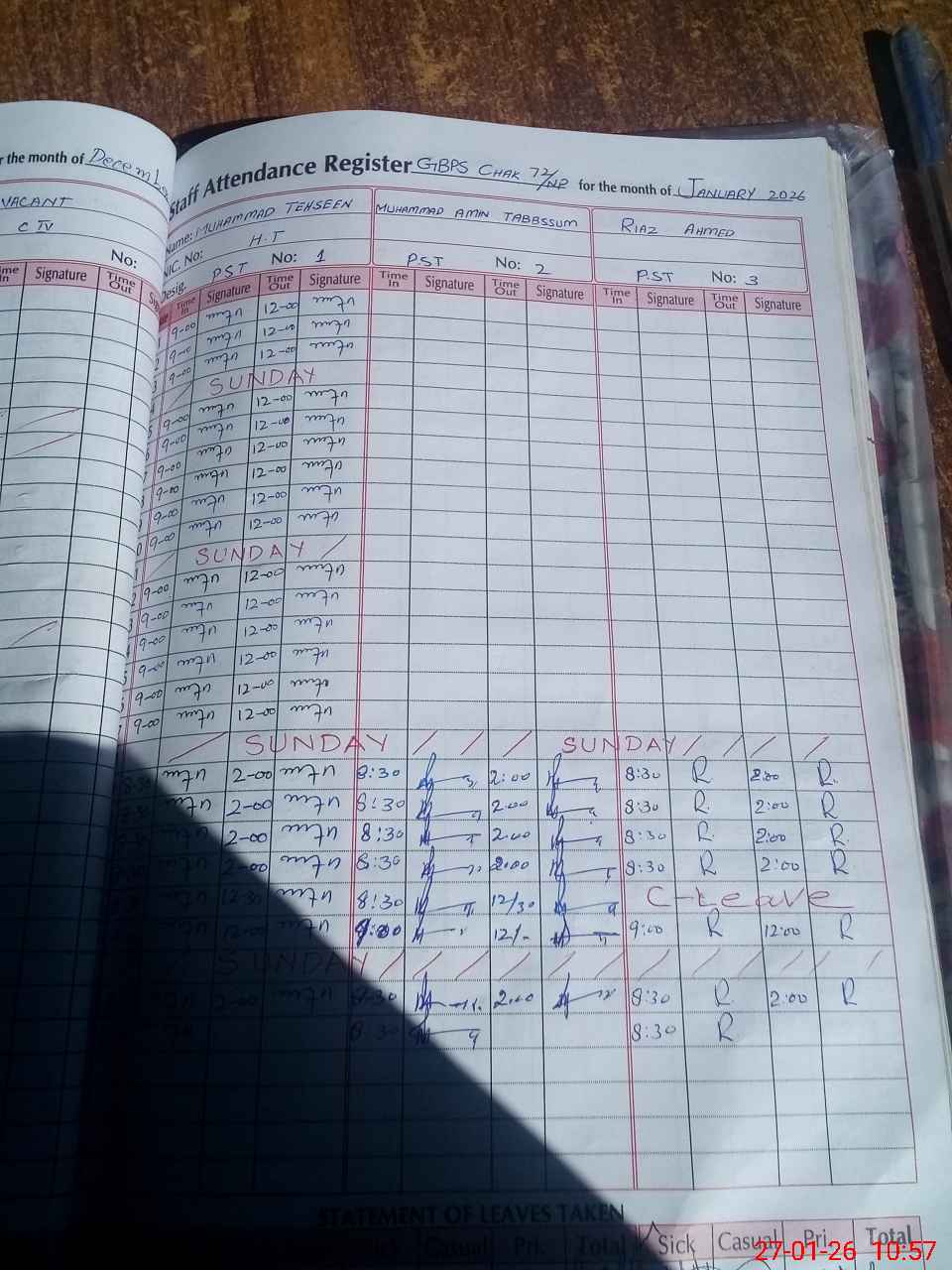| CNIC | Full Name | Designation | R/C | Absence During Last Calender Month |