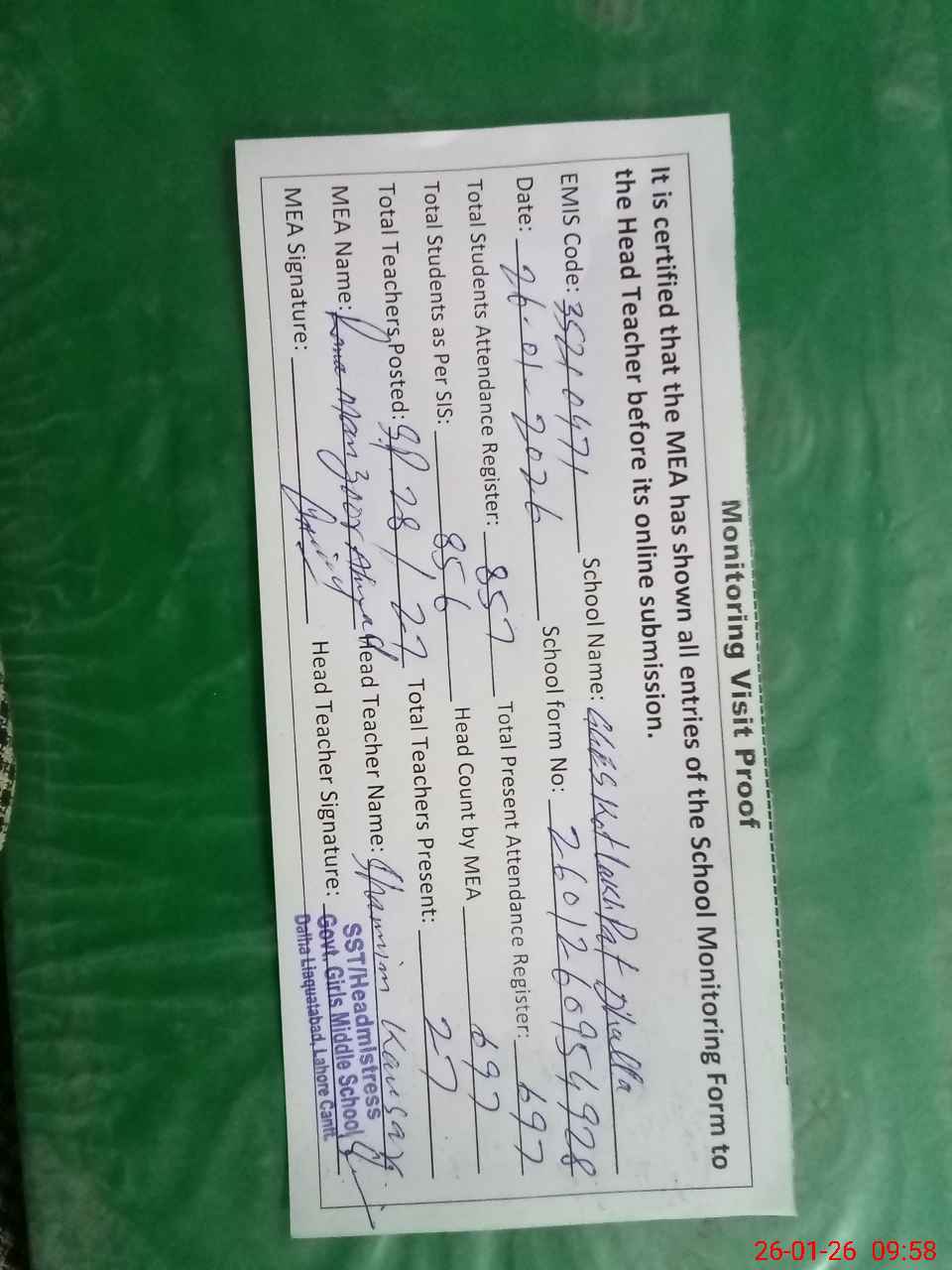 | Attendance Register | Head Teacher | MEA with School | Visit Proof |