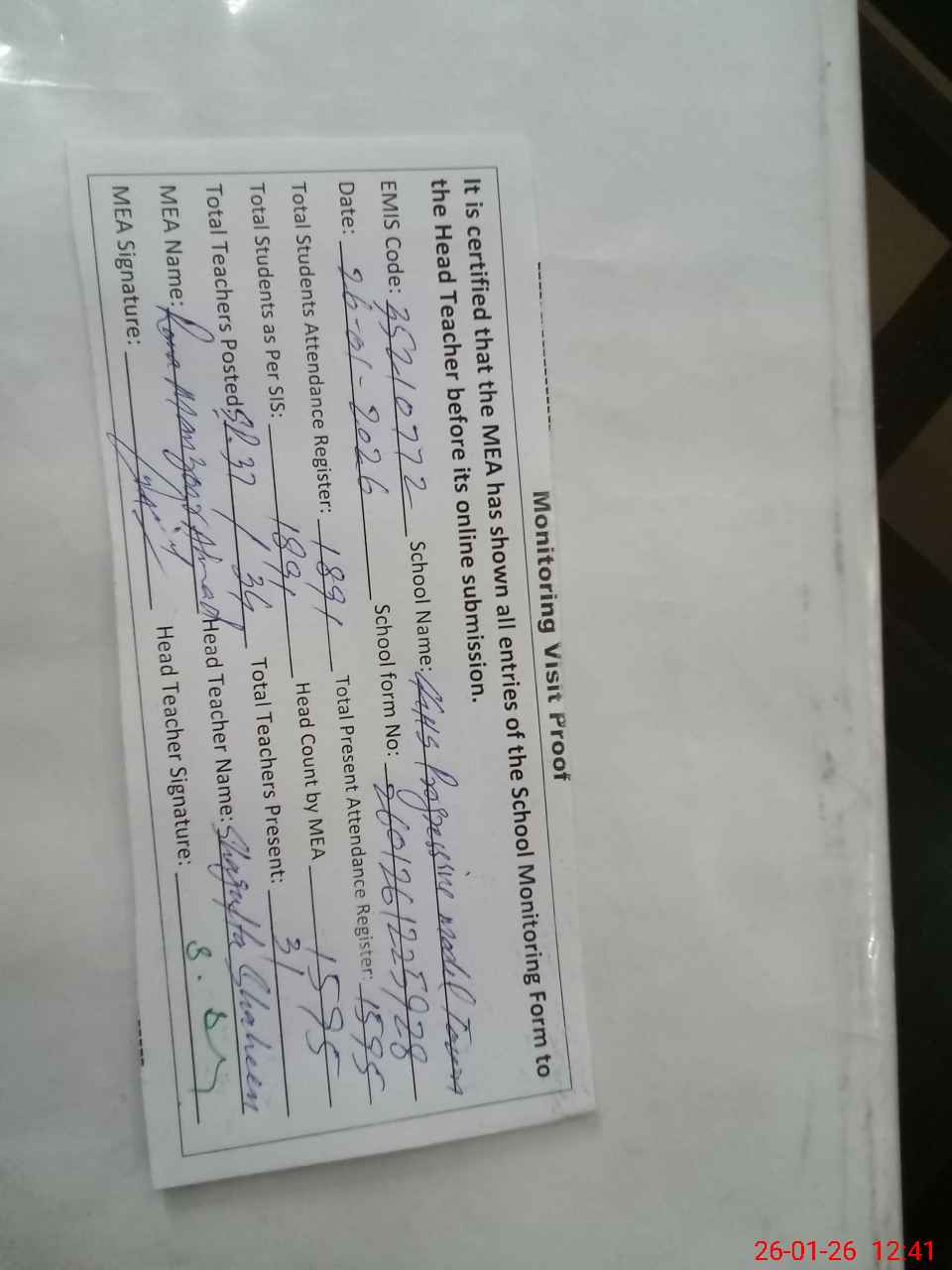 | Attendance Register | Head Teacher | MEA with School | Visit Proof |