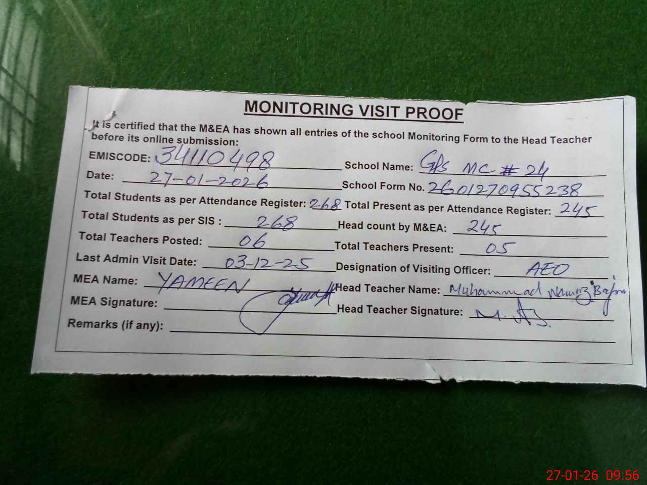 | EMIS Code: 34110498 | Name of School: GPS MC NO.24 (Ferozwala Road Gali 15) | |||