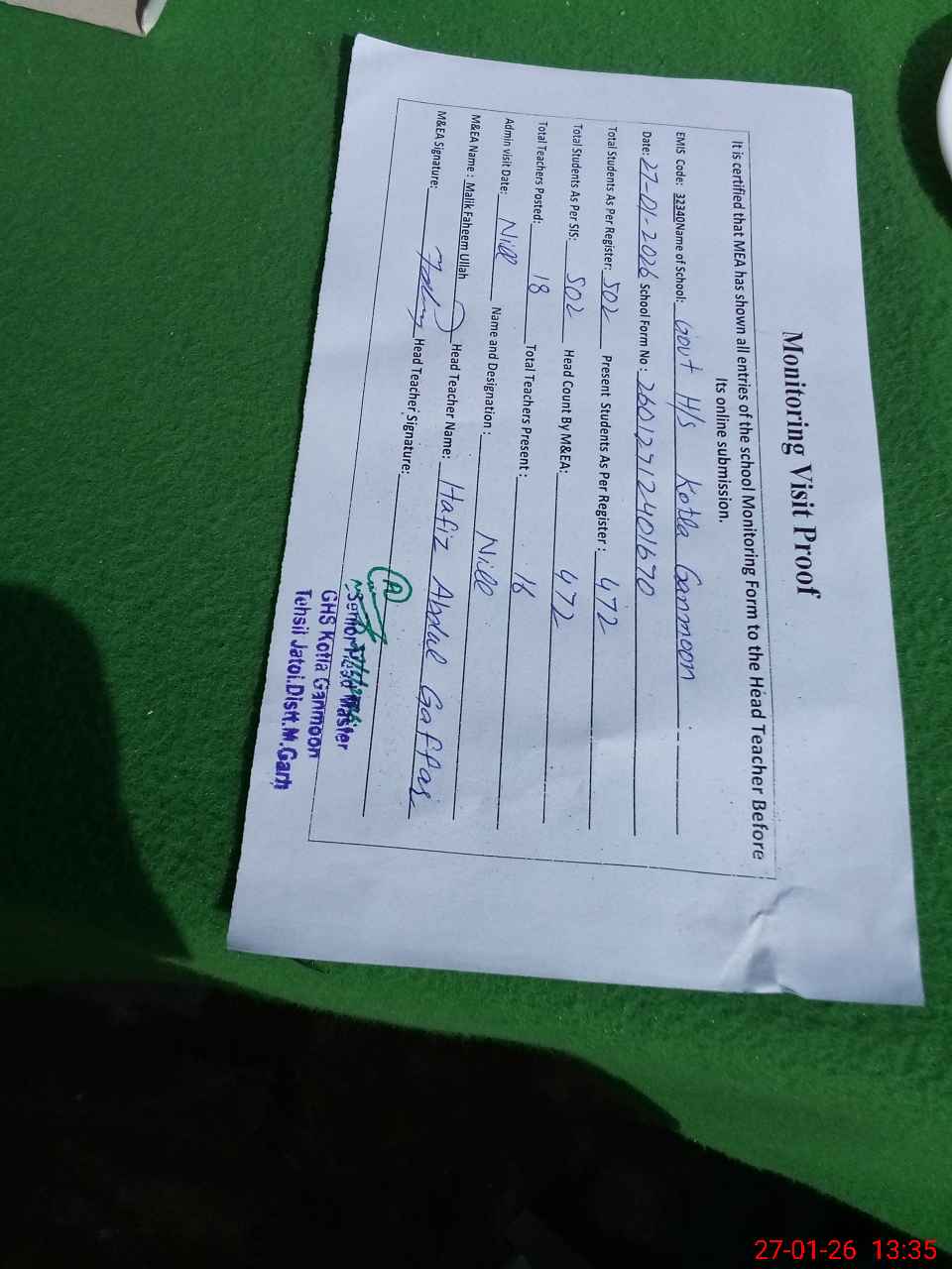 | EMIS Code: 32340009 | Name of School: GHS KOTLA GAMOON | |||