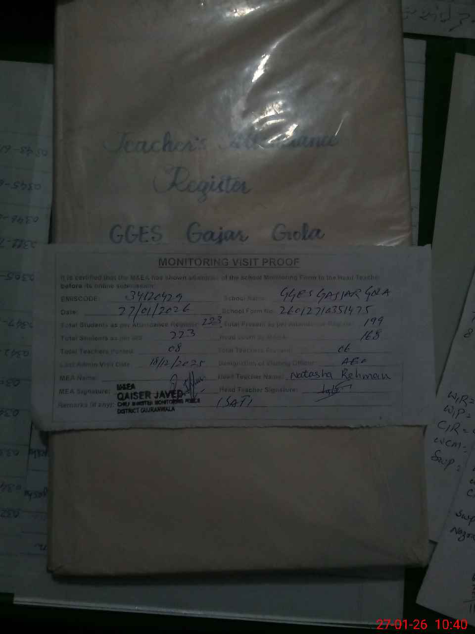 | Attendance Register | Head Teacher | MEA with School | Visit Proof |
