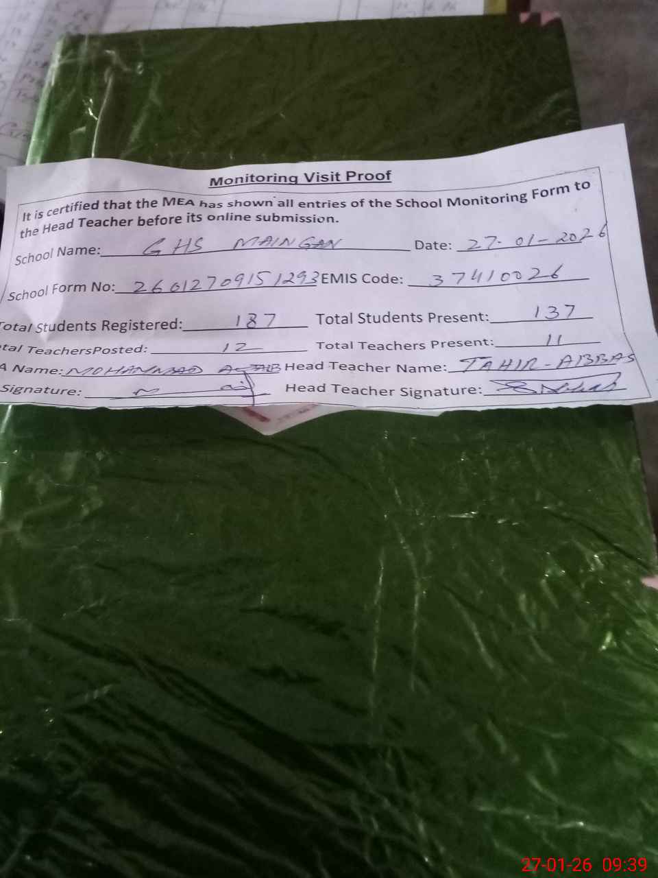 | Attendance Register | Head Teacher | MEA with School | Visit Proof |