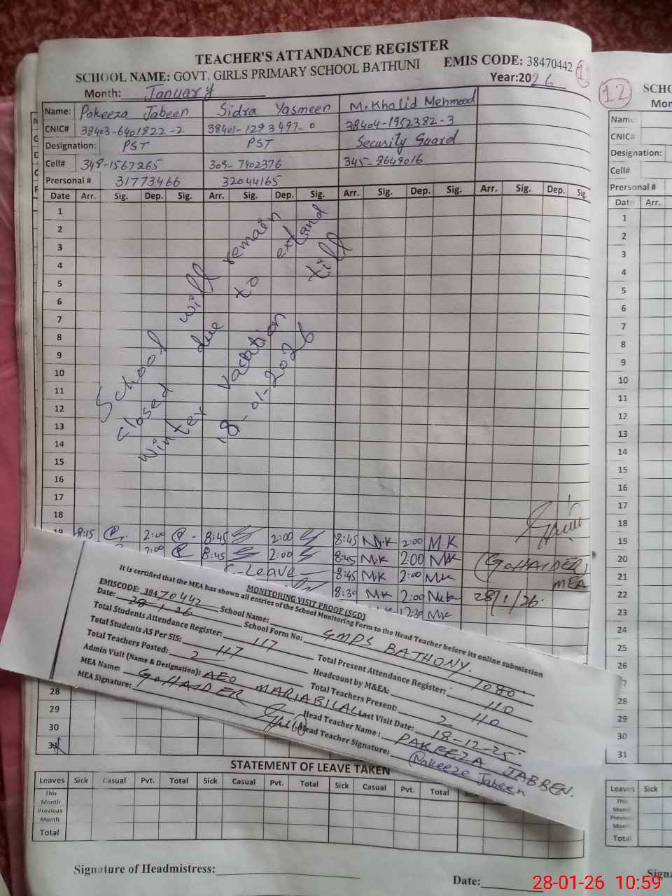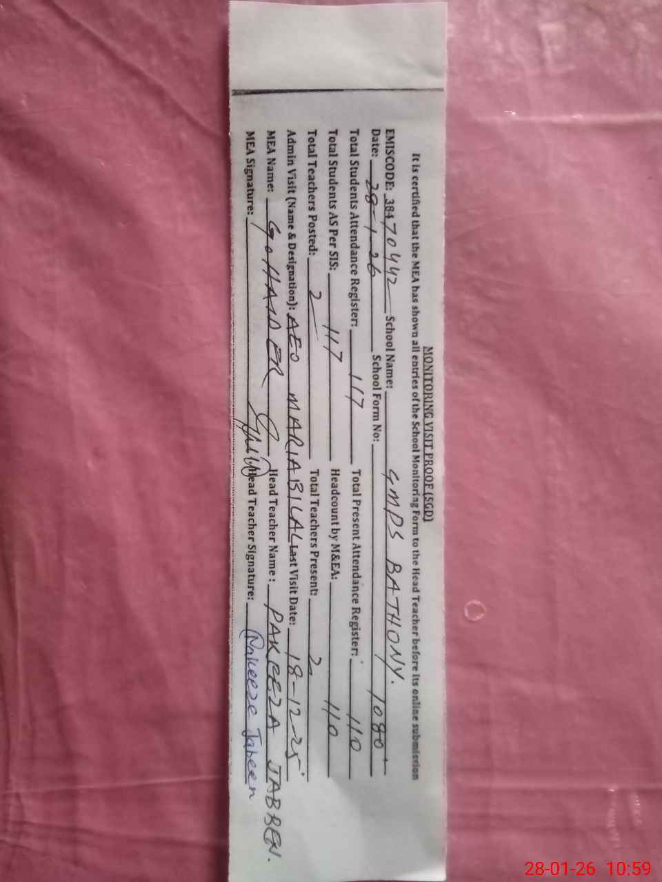 | Attendance Register | Head Teacher | MEA with School | Visit Proof |