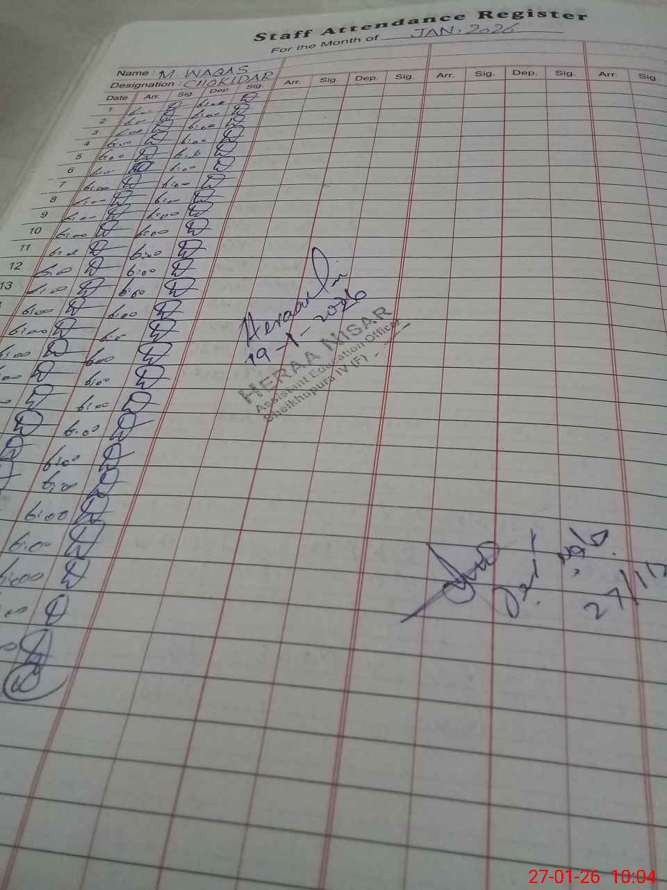 | Monitoring Date: 27-01-2026 | Start Time: 27-01-2026 09:10 AM | End Time: 27-01-2026 10:04 AM | Name of MEA: Ja**** Iq**** | |