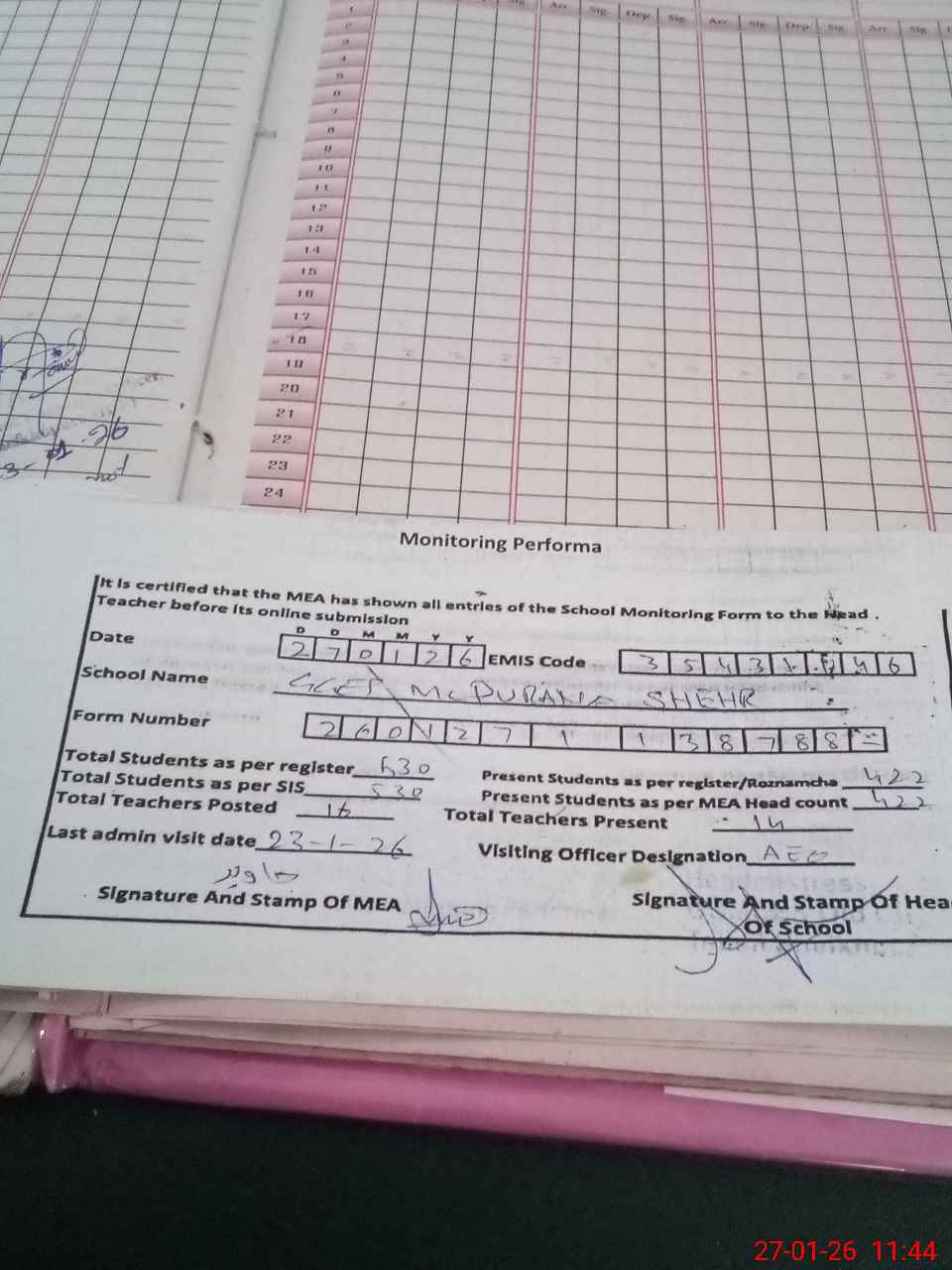 | Attendance Register | Head Teacher | MEA with School | Visit Proof |
