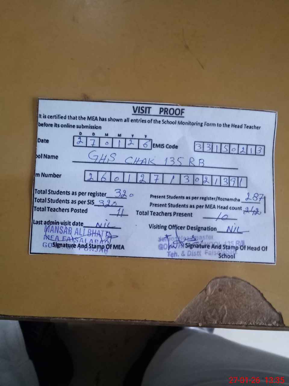| Attendance Register | Head Teacher | MEA with School | Visit Proof |