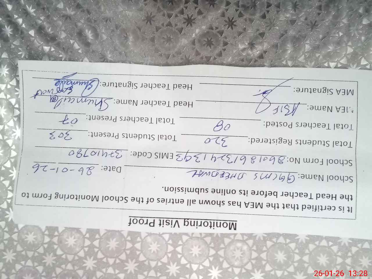 | Attendance Register | Head Teacher | MEA with School | Visit Proof |