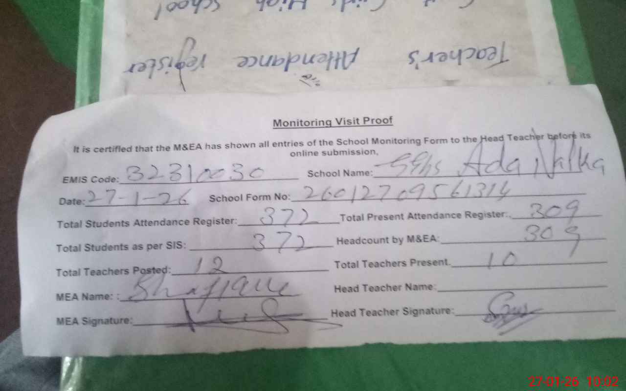 | Attendance Register | Head Teacher | MEA with School | Visit Proof |