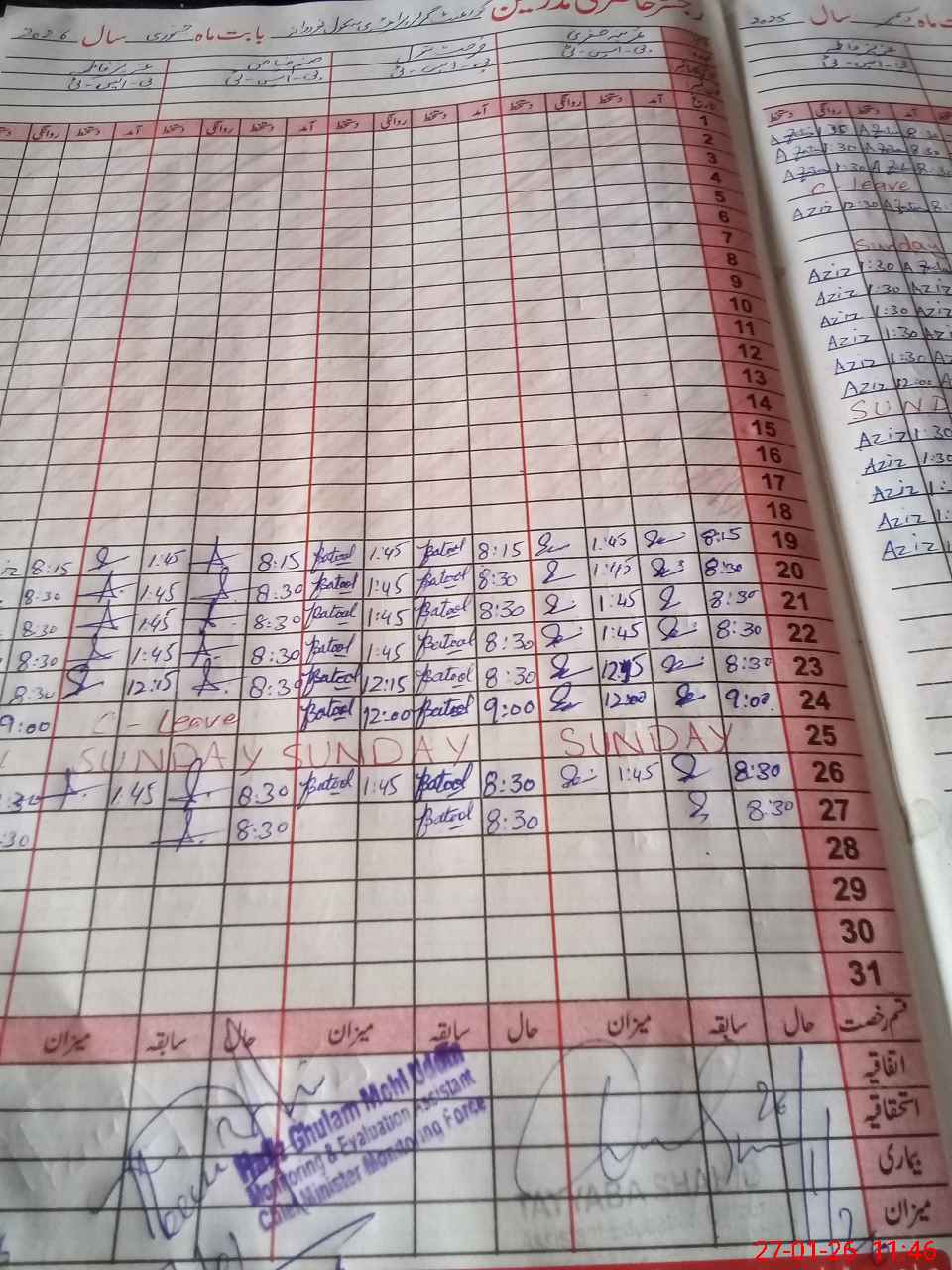 | CNIC | Full Name | Designation | R/C | Absence During Last Calender Month |