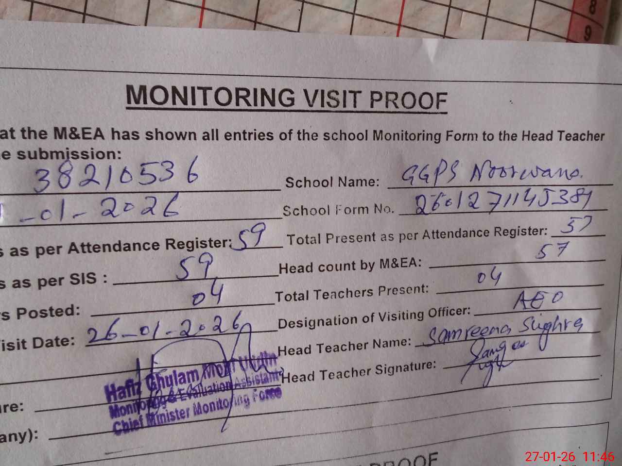 | Attendance Register | Head Teacher | MEA with School | Visit Proof |