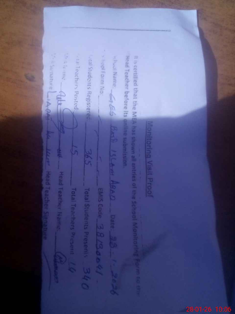 | Certified that this School was Inspected by the Undersigned MEA/DMO Today and the Information Stated Above is as Per Record. | |||||