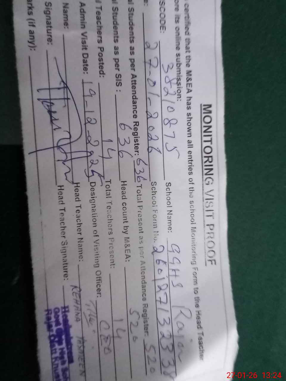 | Name: RE**** YA**** Designation: (School Headmaster's/Headmistress's) SST GEN Phone/Cell Number: 03**** |
