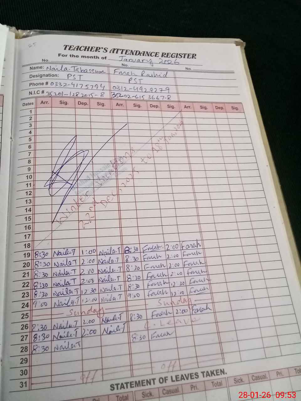 | CNIC | Full Name | Designation | R/C | Absence During Last Calender Month |