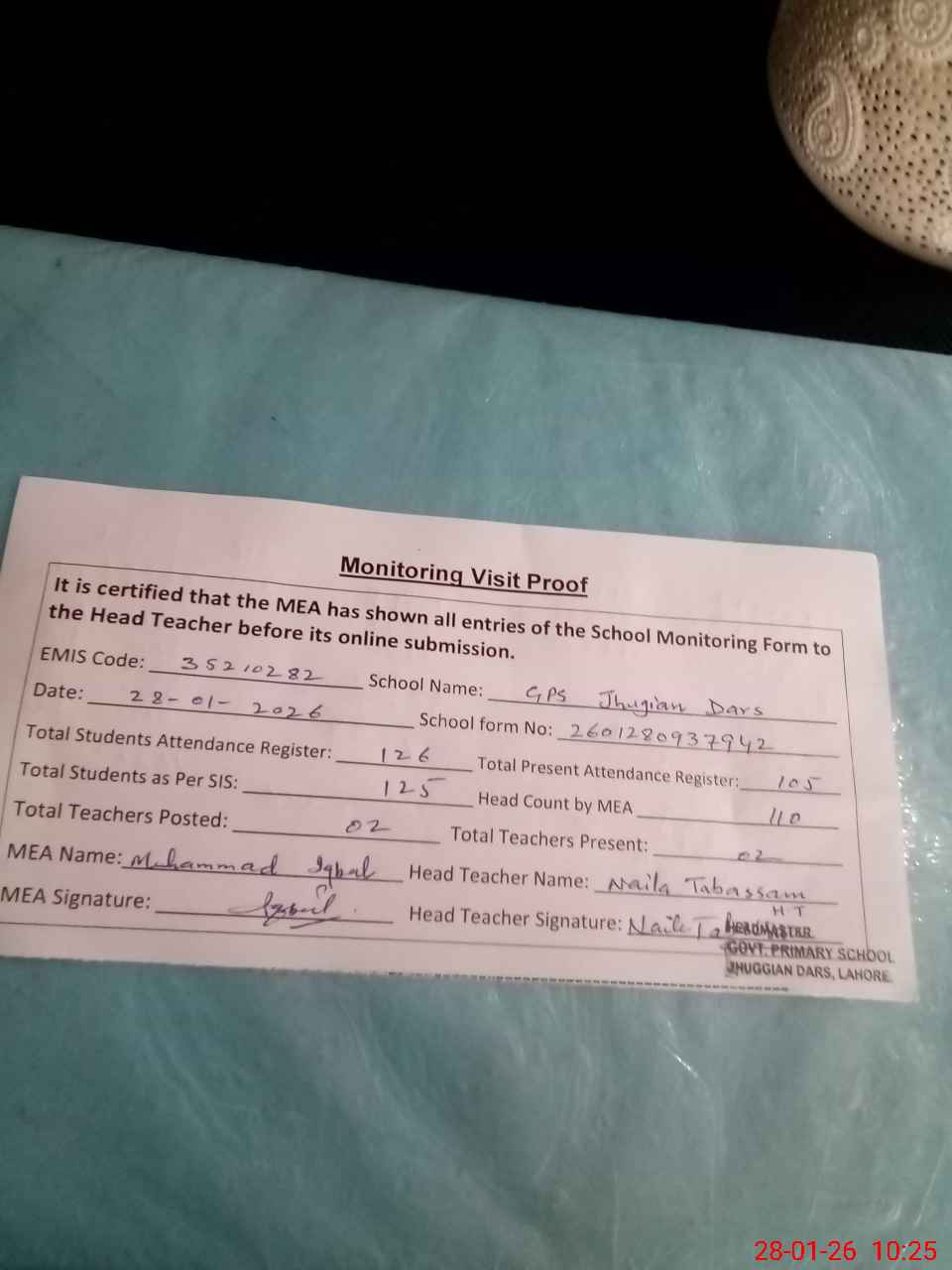 | Attendance Register | Head Teacher | MEA with School | Visit Proof |