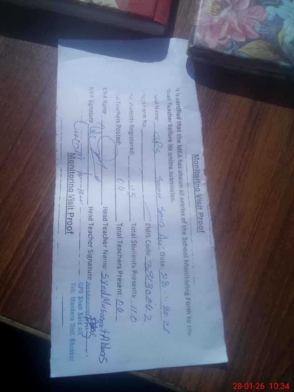 | Attendance Register | Head Teacher | MEA with School | Visit Proof |