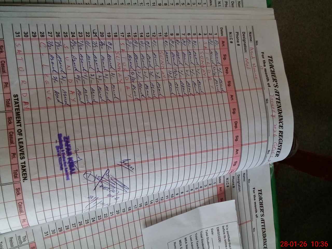 | CNIC | Full Name | Designation | R/C | Absence During Last Calender Month |