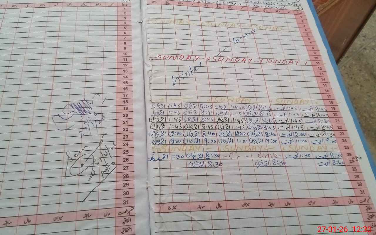 | CNIC | Full Name | Designation | R/C | Absence During Last Calender Month |