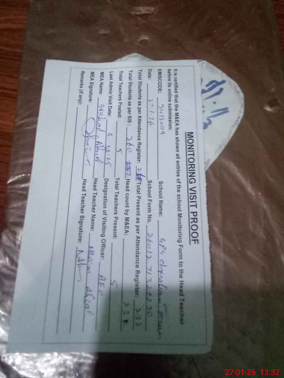 | Attendance Register | Head Teacher | MEA with School | Visit Proof |