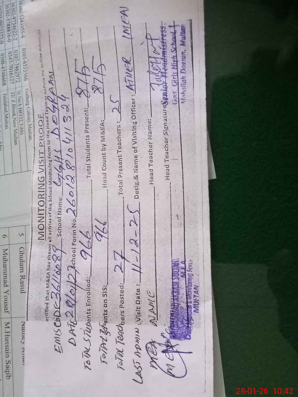 | EMIS Code: 36110089 | Name of School: GGHS MUHALLAH DOGRAN QASIMPUR COLONY MULTAN | |||