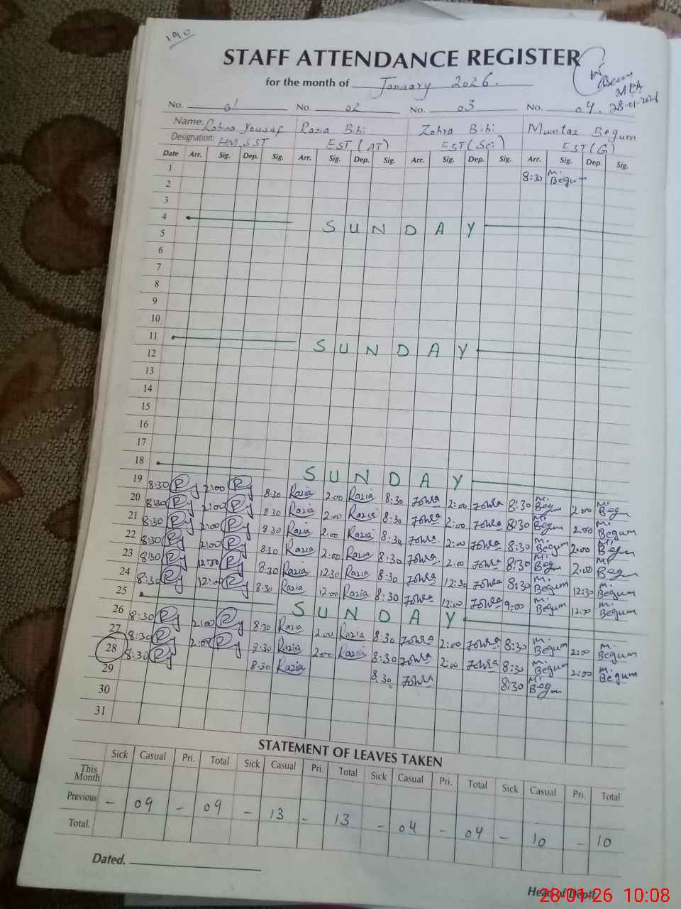 | Leave | Duty | Absent | Maternity | Medical | Ex- Pak |