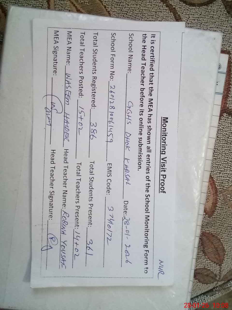 | Attendance Register | Head Teacher | MEA with School | Visit Proof |