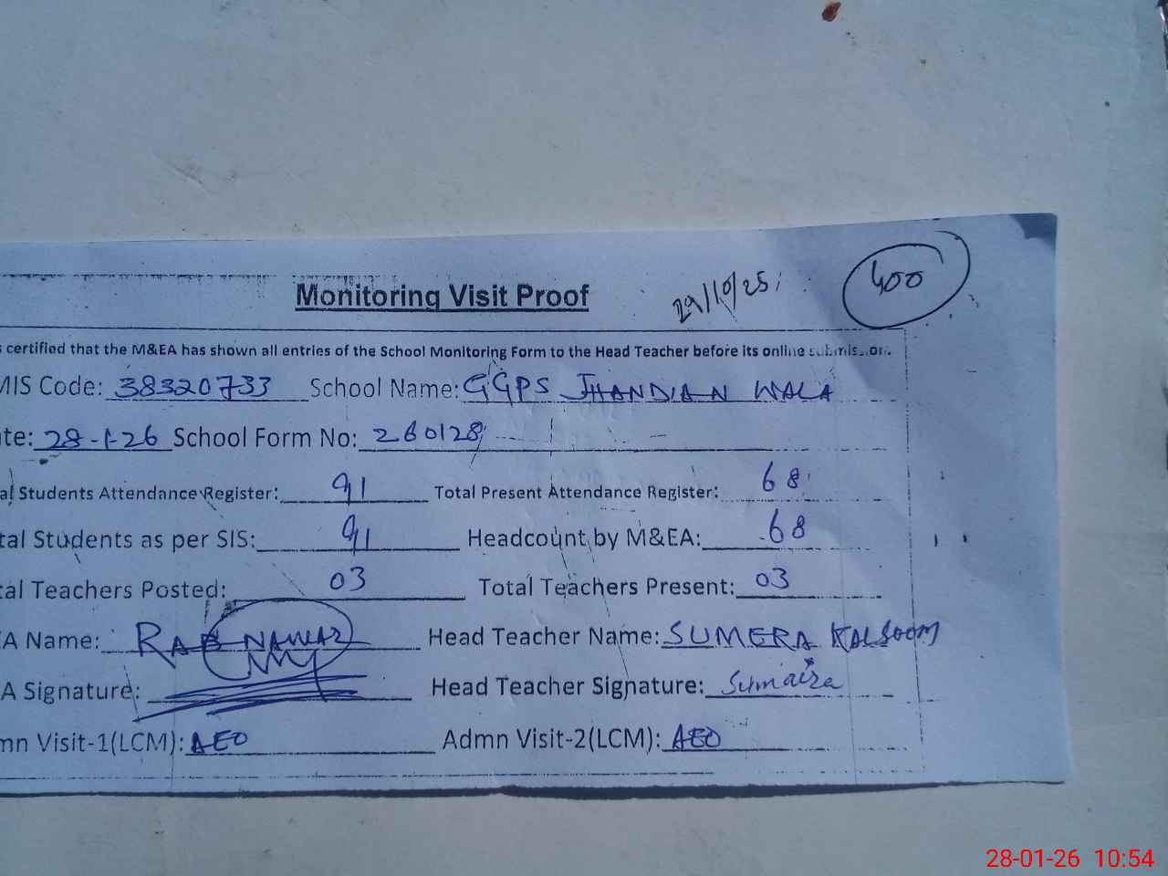 | Attendance Register | Head Teacher | MEA with School | Visit Proof |