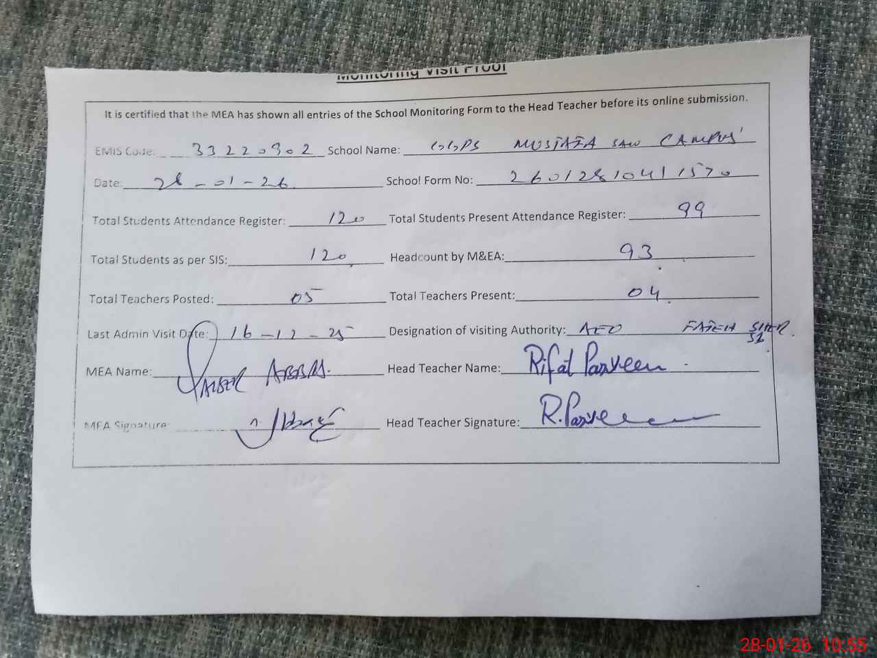 | Attendance Register | Head Teacher | MEA with School | Visit Proof |