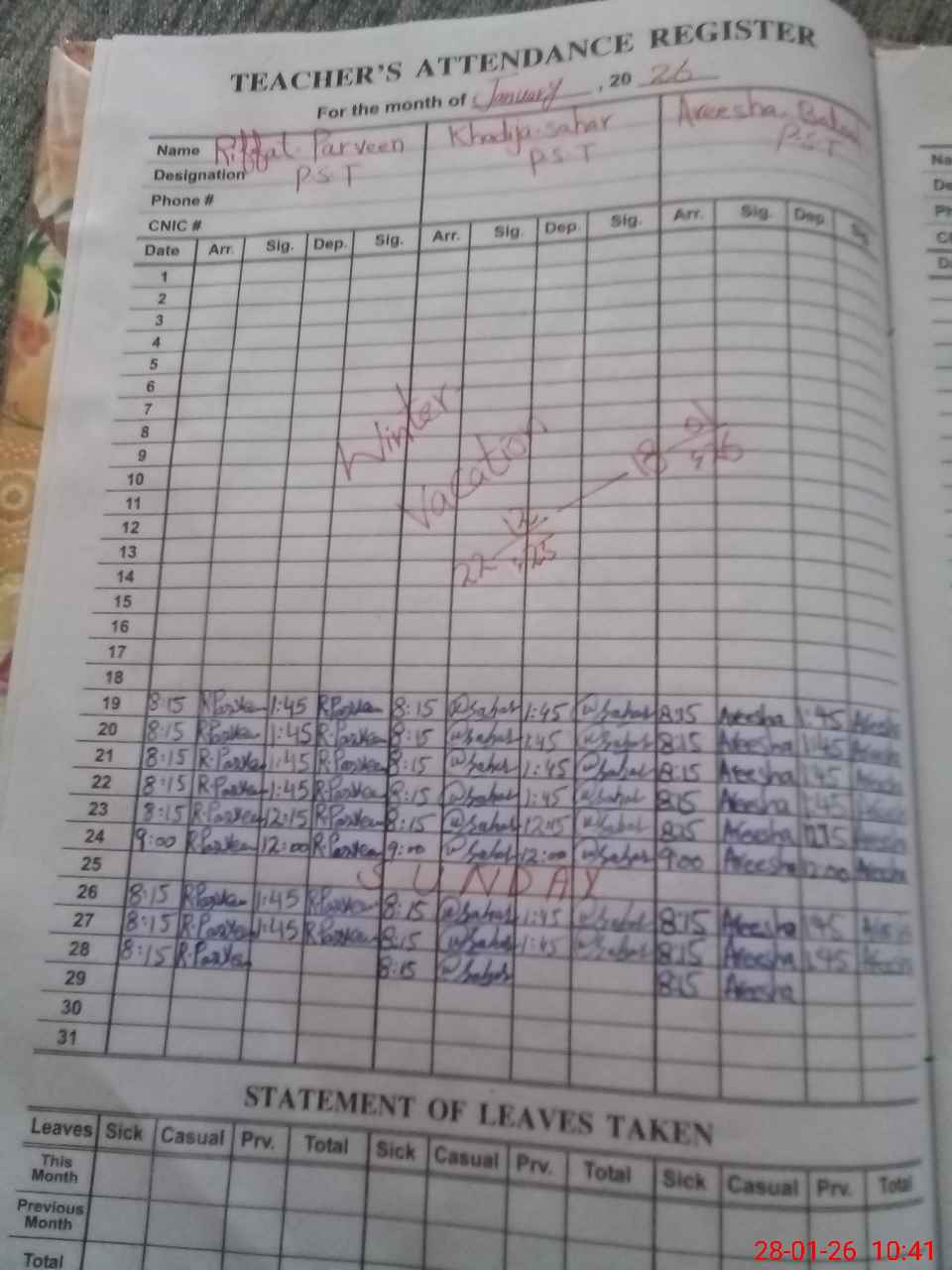 | CNIC | Full Name | Designation | R/C | Absence During Last Calender Month |